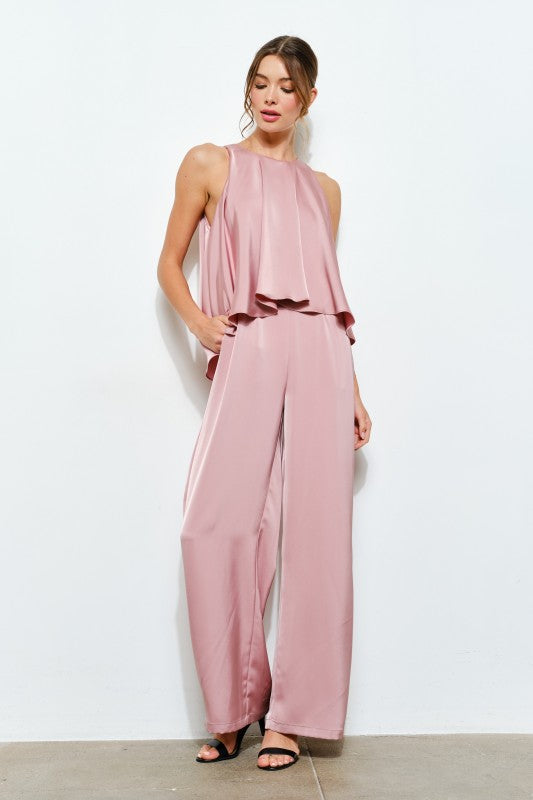 Este jumpsuit en tono rosa satinado es sinónimo de elegancia moderna. Confeccionado en 100% poliéster, su diseño fluido con caída sofisticada, espalda con detalle en capa y pantalón palazzo alarga la figura con un estilo refinado. Perfecto para eventos, cenas o donde quieras brillar sin esfuerzo.