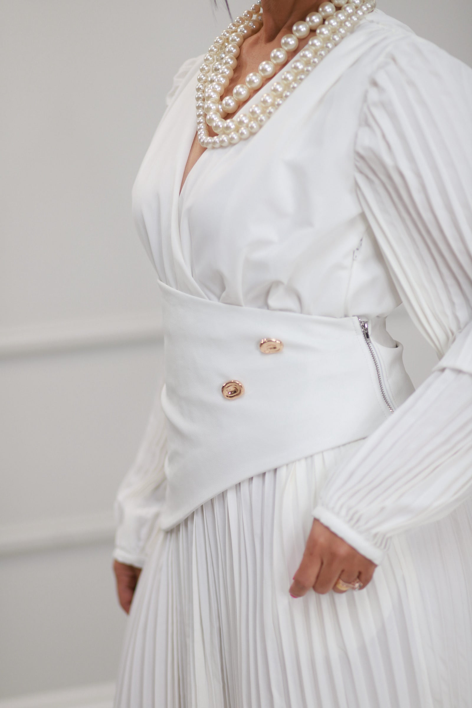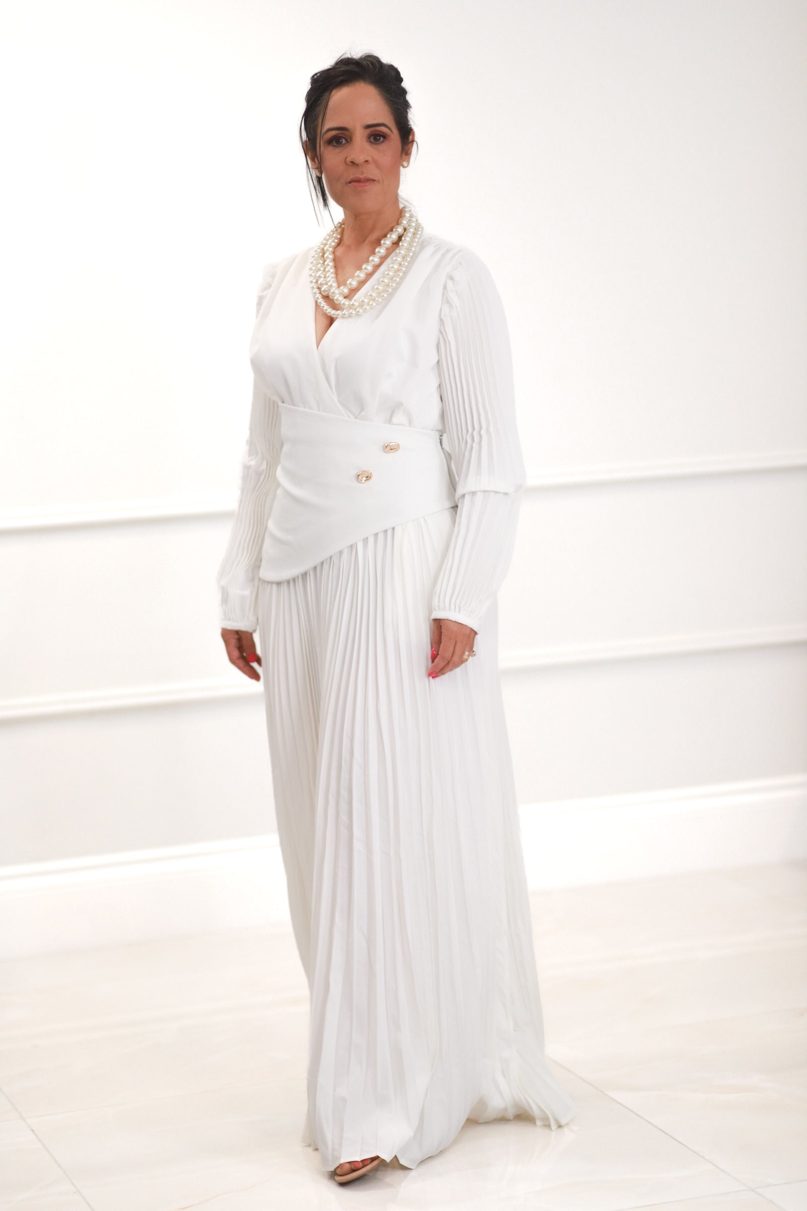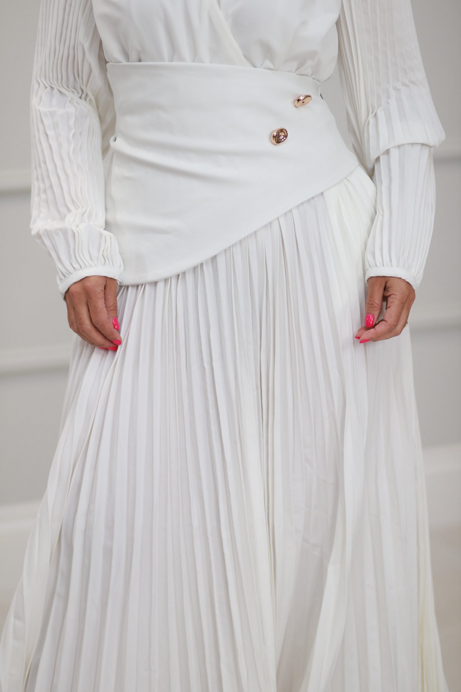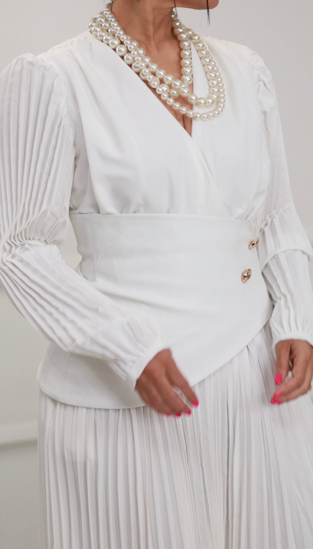 Vestido largo plisado en blanco perla, con mangas largas estructuradas y detalle tipo fajín asimétrico con botones dorados que acentúa la cintura. Su escote cruzado y el plisado delicado aportan un aire de distinción y feminidad. Combinado con un collar de perlas, este look irradia poder, elegancia y clase.
