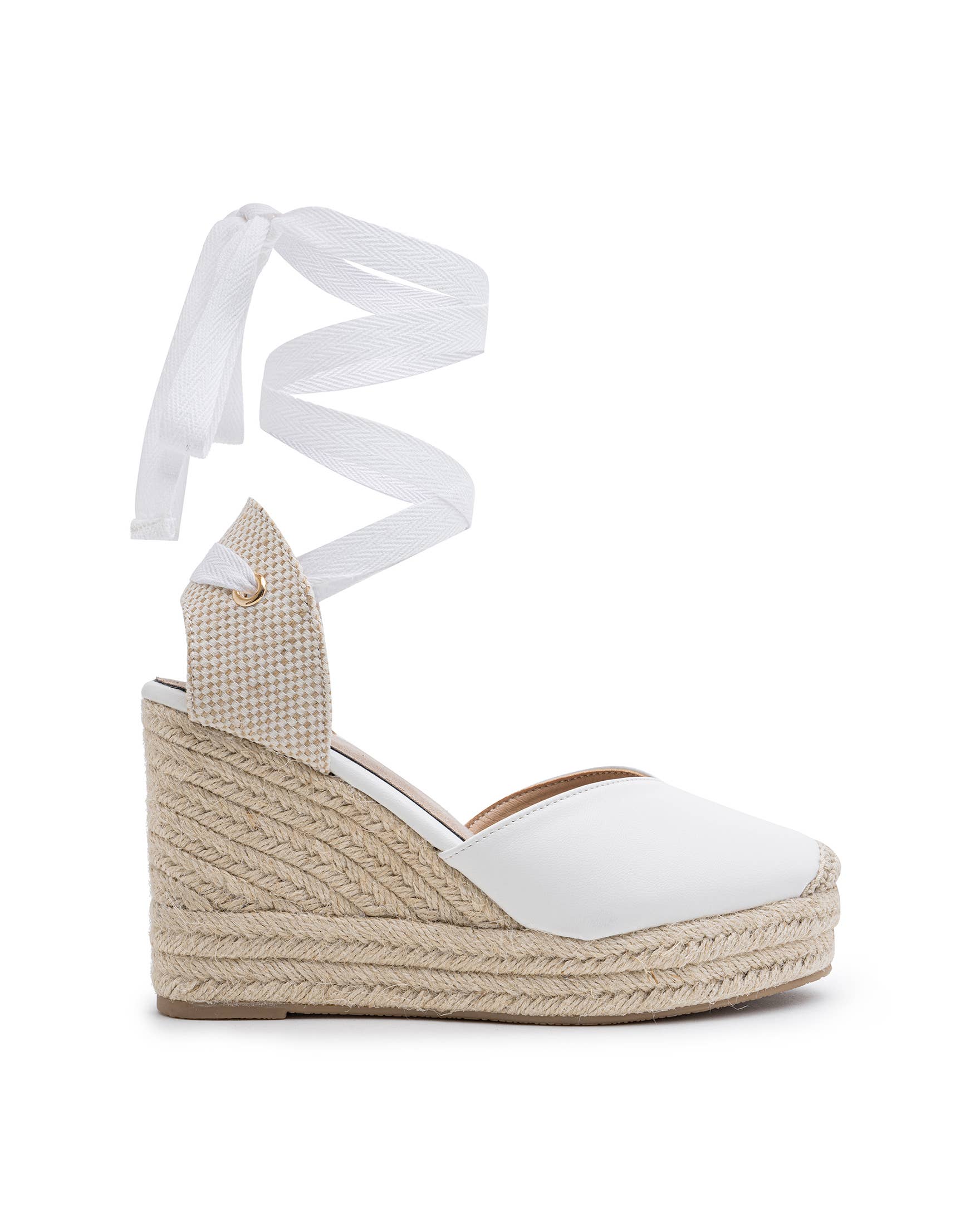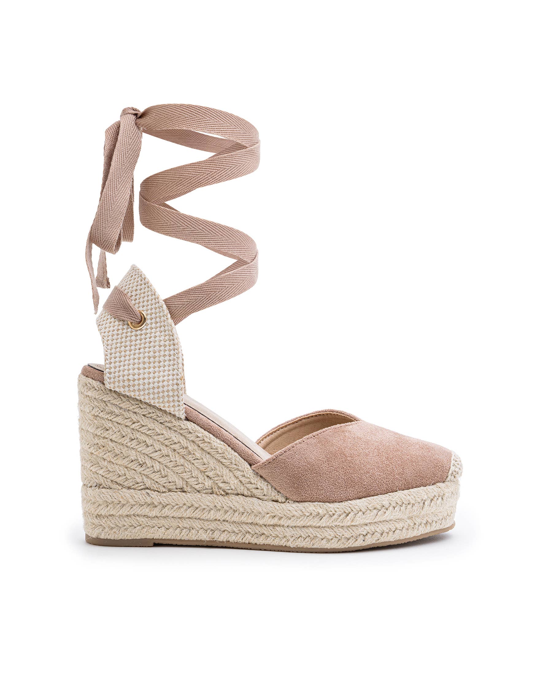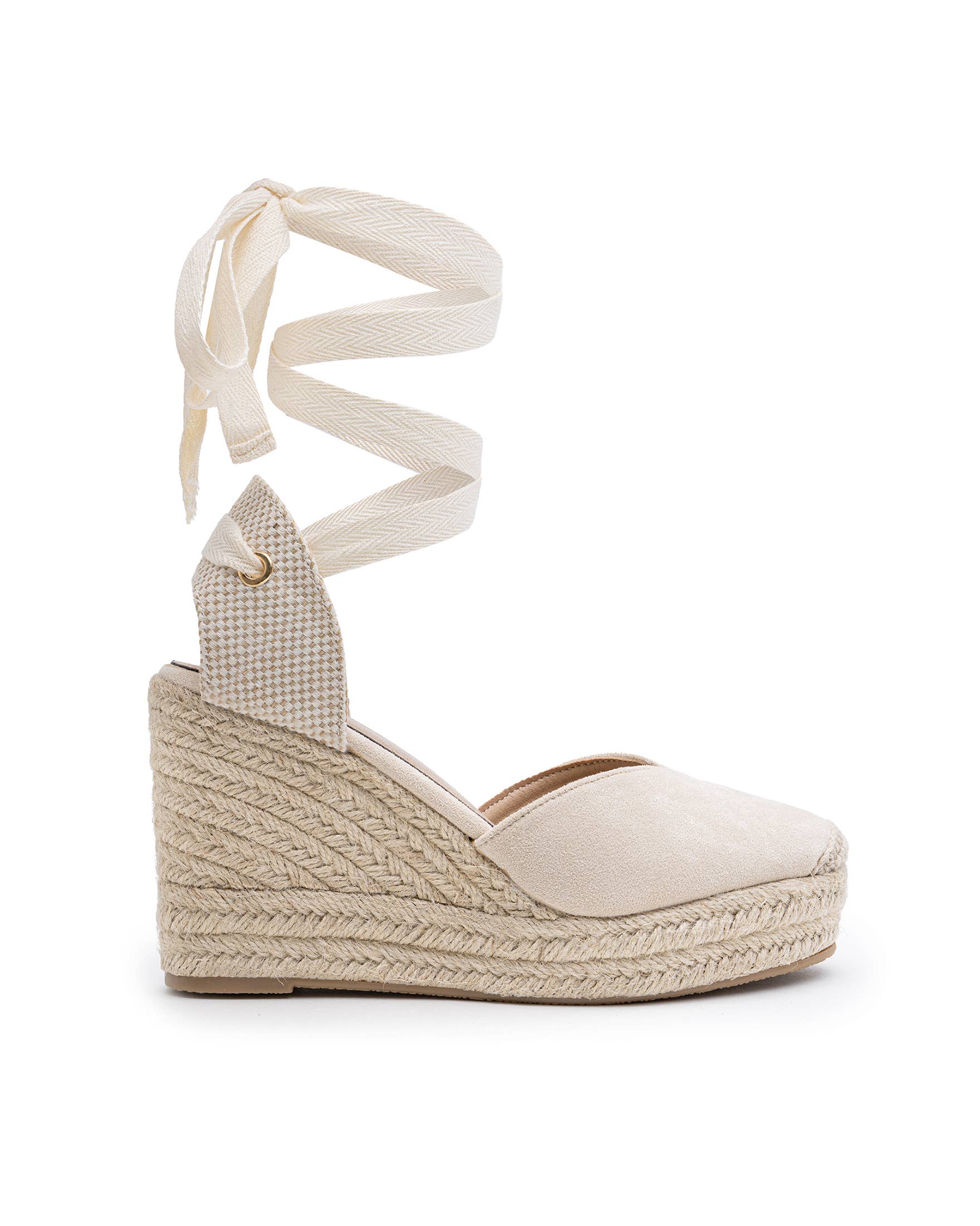 Basic High Wedge Espadrille Sandals. Cotton Herringbone Ribbon Closure, cushioned insole.