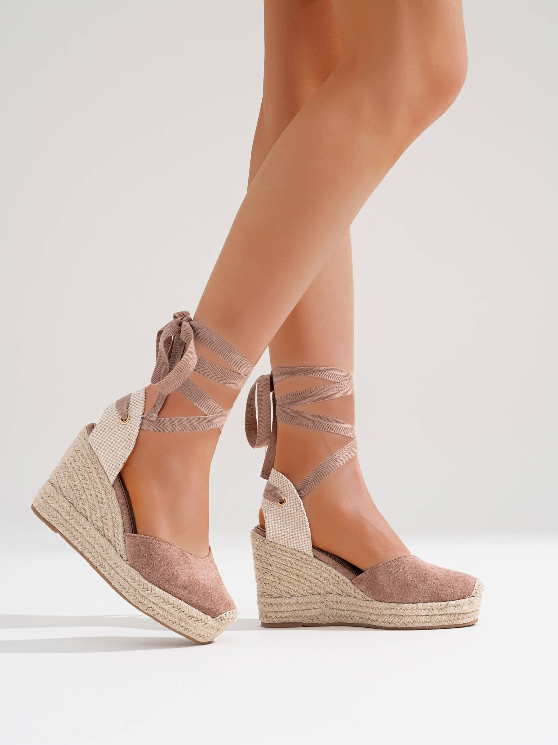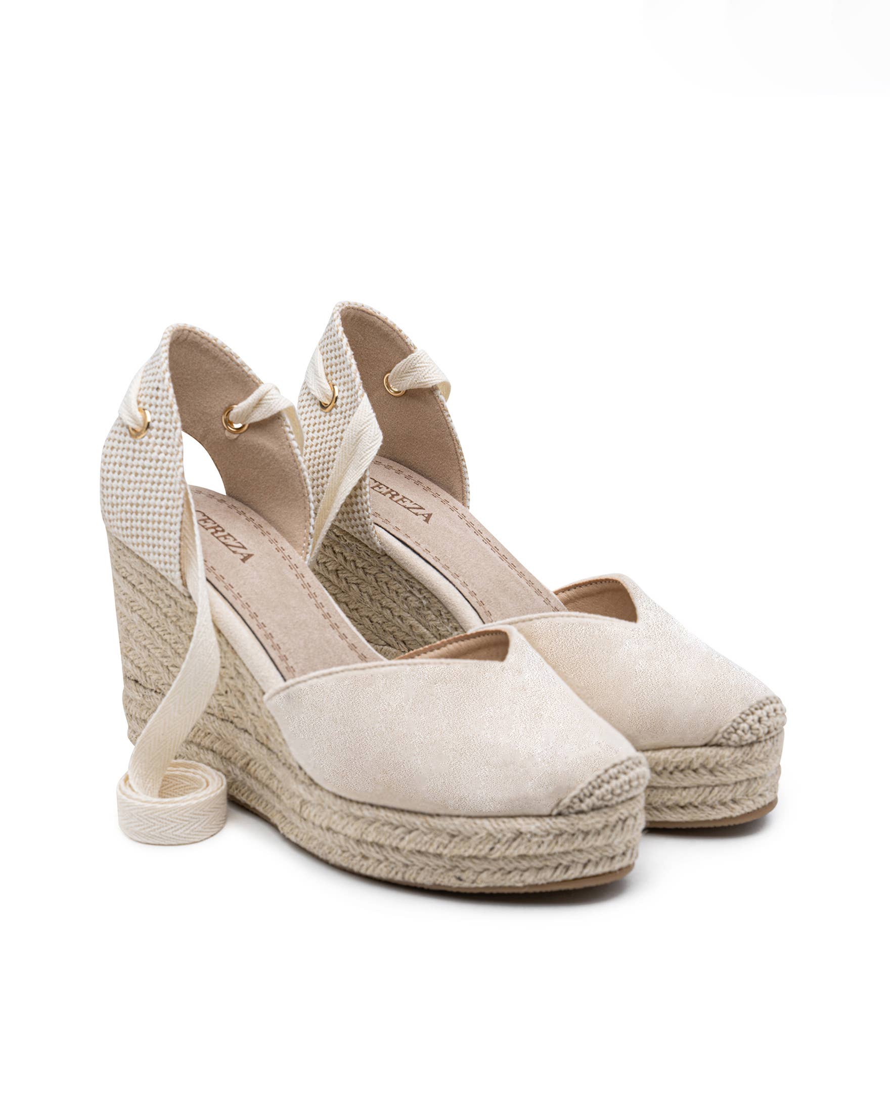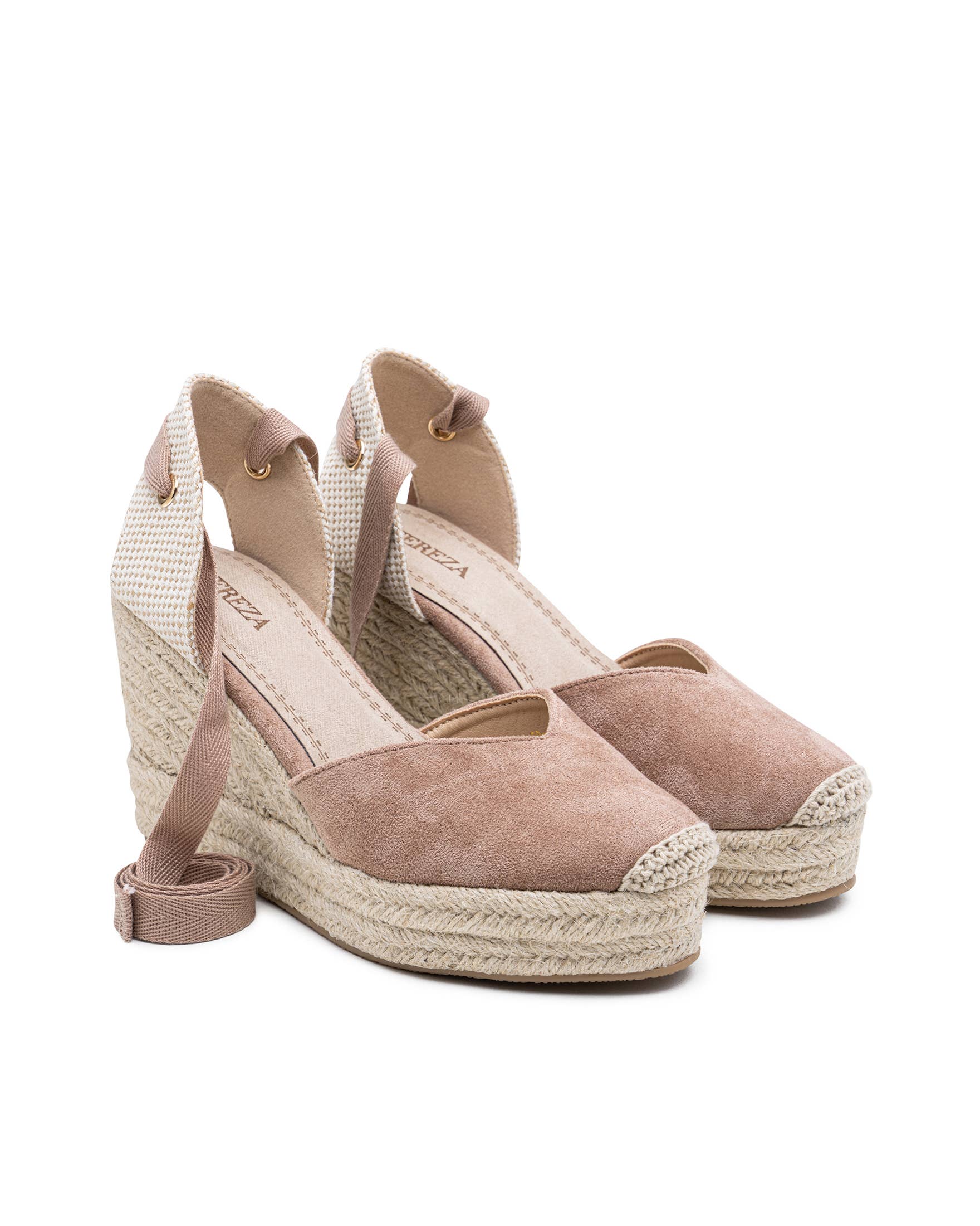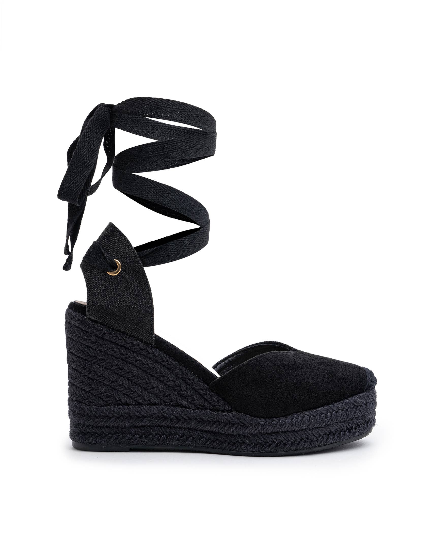 Basic High Wedge Espadrille Sandals. Cotton Herringbone Ribbon Closure, cushioned insole.