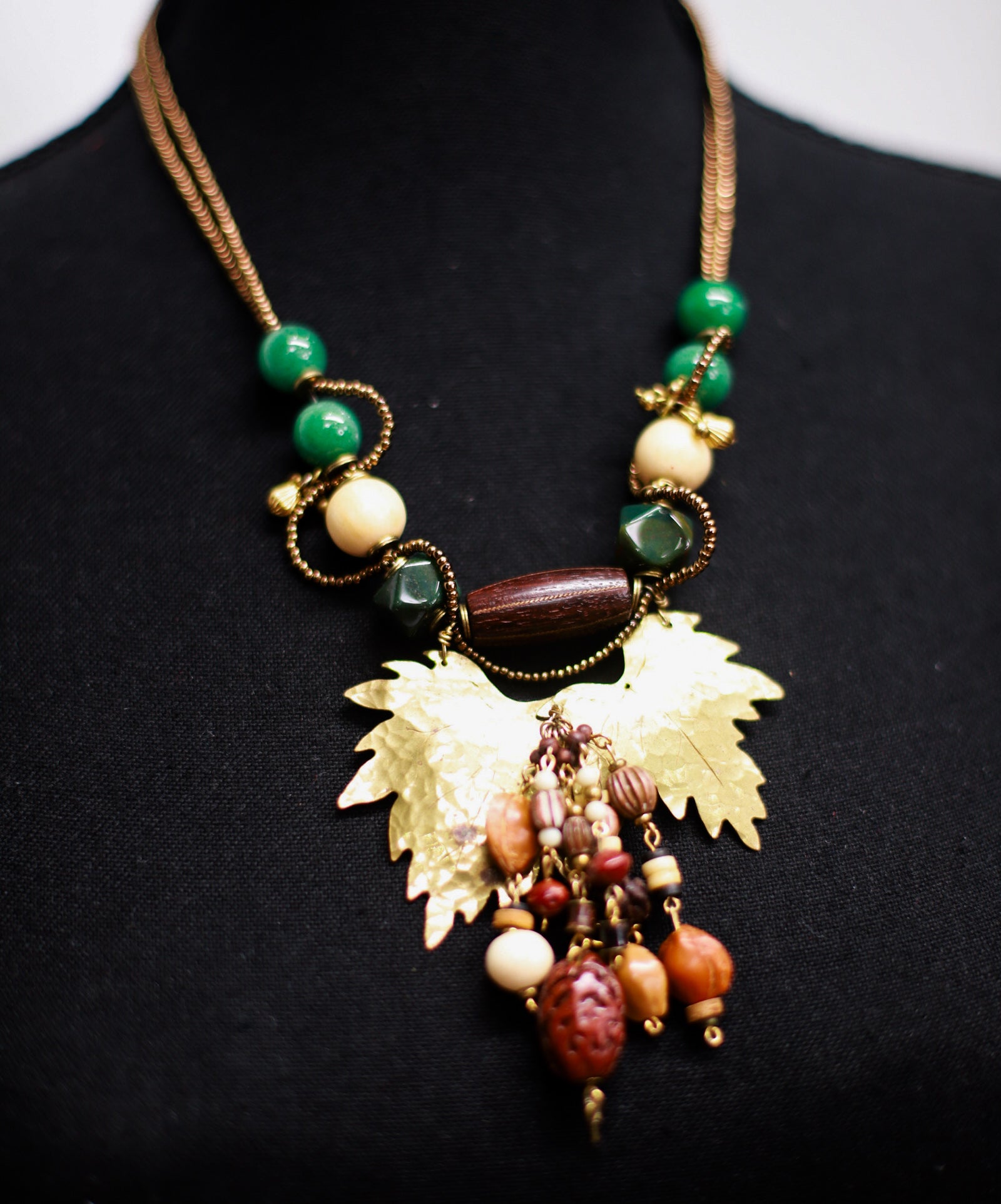 An artistic piece inspired by the beauty of nature, featuring a bold golden leaf centerpiece adorned with cascading earthy beads. The combination of deep green, cream, and warm wooden tones creates a harmonious balance between elegance and rustic charm.
