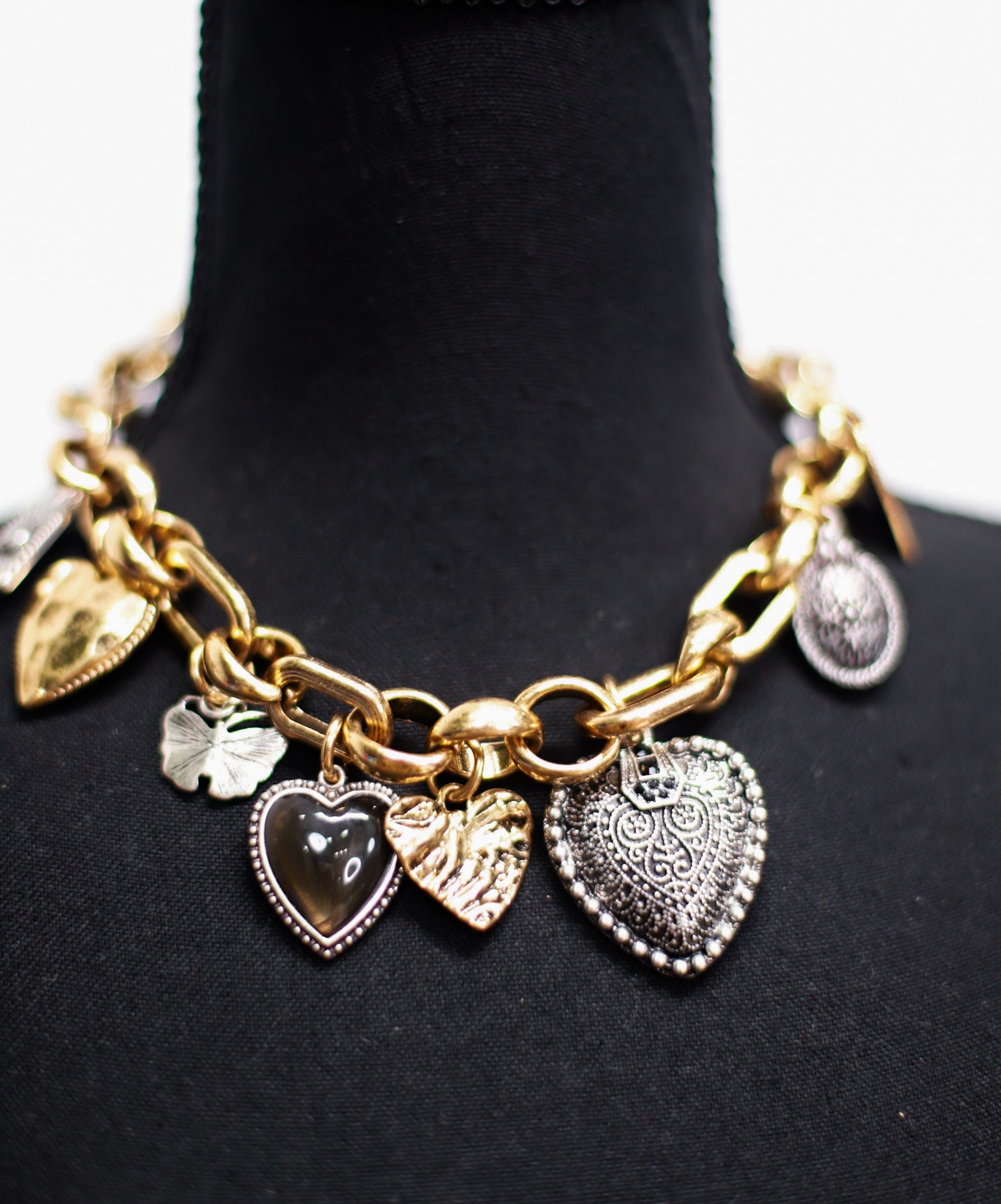 Un diseño exclusivo de eslabones dorados estilo chunky adornado con dijes en forma de corazón y medallones vintage que transmiten amor, fuerza y elegancia. Cada detalle combina texturas doradas, plateadas y un toque de brillo negro que lo convierten en una pieza única y sofisticada.