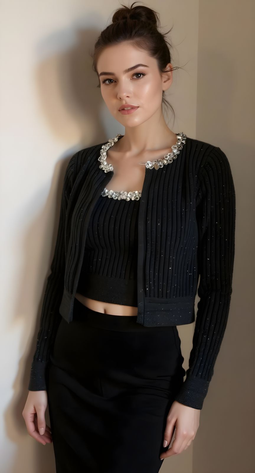 Nuestro Crystal Glam Twin Set es la definición de elegancia moderna. Este conjunto de dos piezas incluye un crop top y un cardigan ligero, ambos confeccionados en un tejido acanalado negro con destellos sutiles y un adorno deslumbrante de cristales en el borde, creando un look sofisticado y ultra femenino.