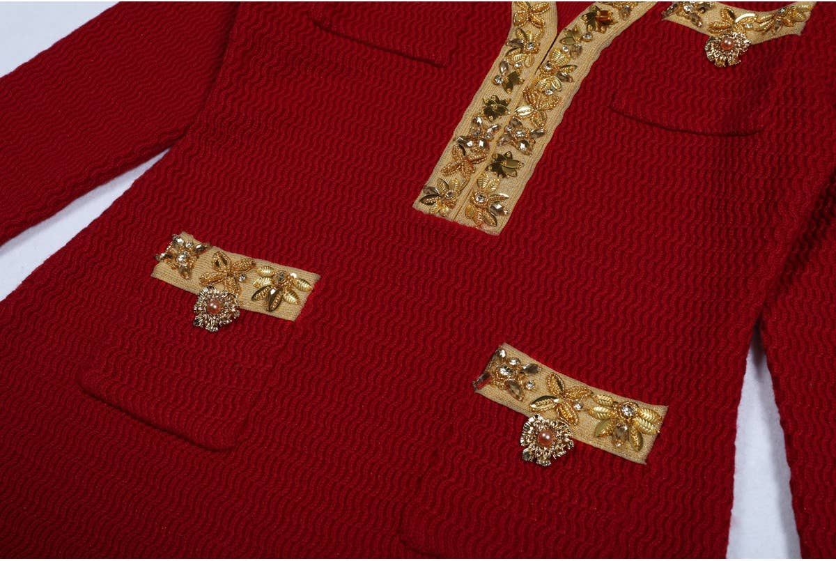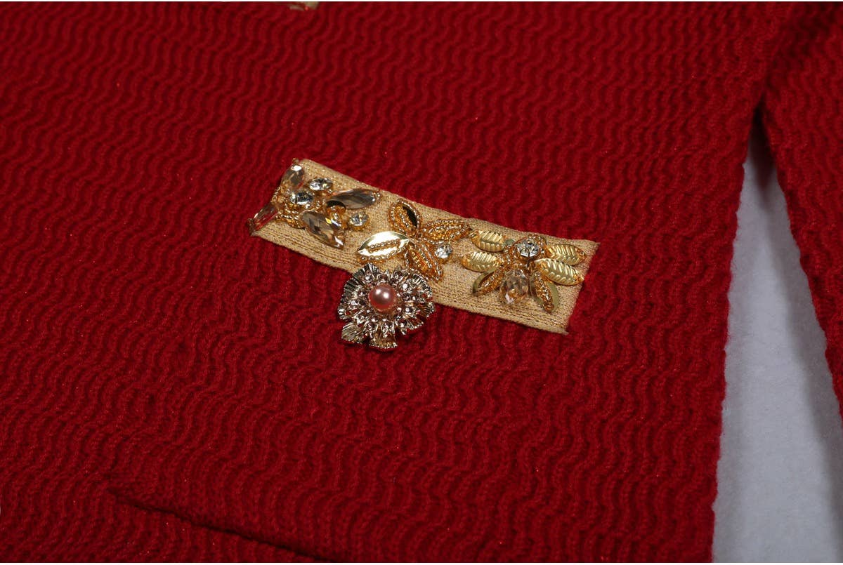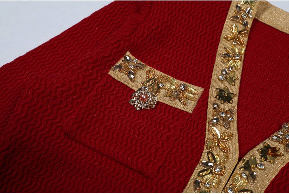 embellishments along the neckline, pockets, and cuffs provide a luxurious finish. The dress also includes two front pockets adorned with gold beading and a ruffled hemline for added charm. Perfect for special occasions, this dress combines comfort and style effortlessly, making it a standout piece in any wardrobe.