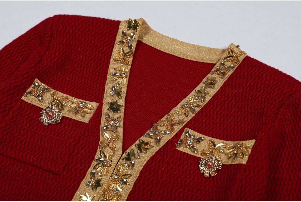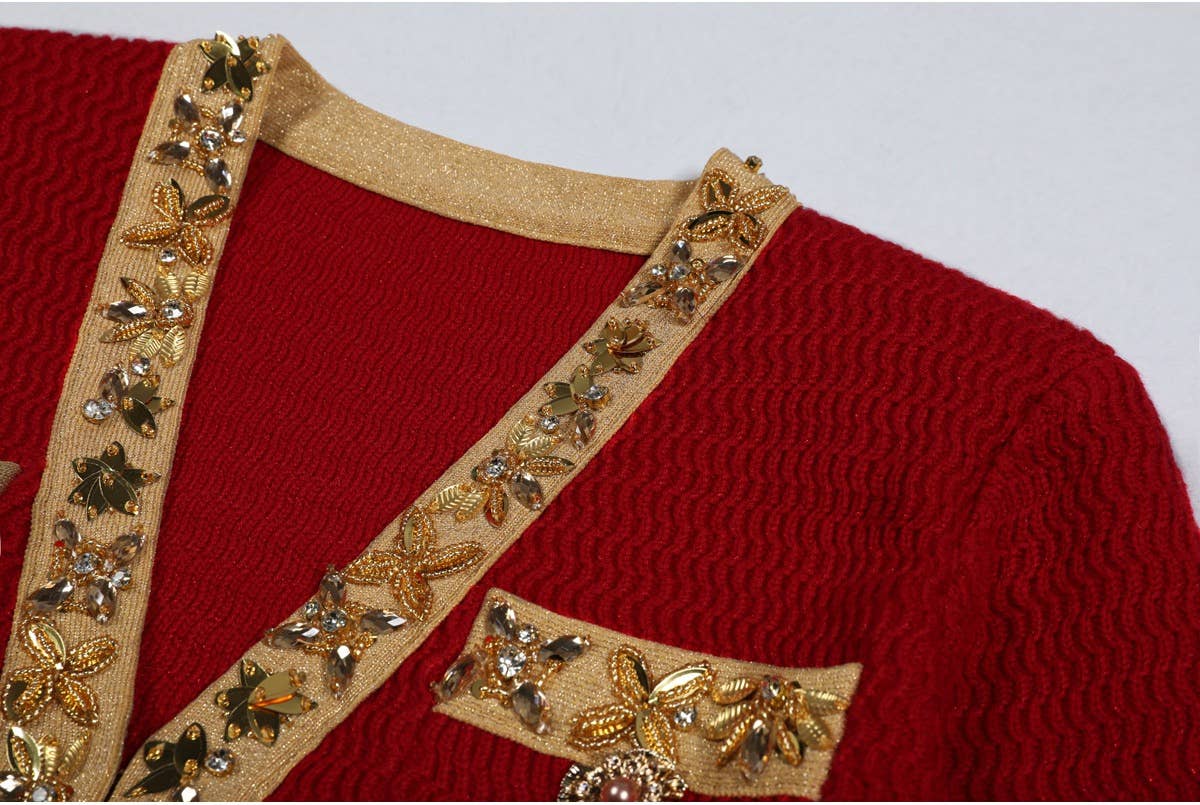 Carolina Elegant Knitted V-Neck Hand-Beaded Long-Sleeve Dress