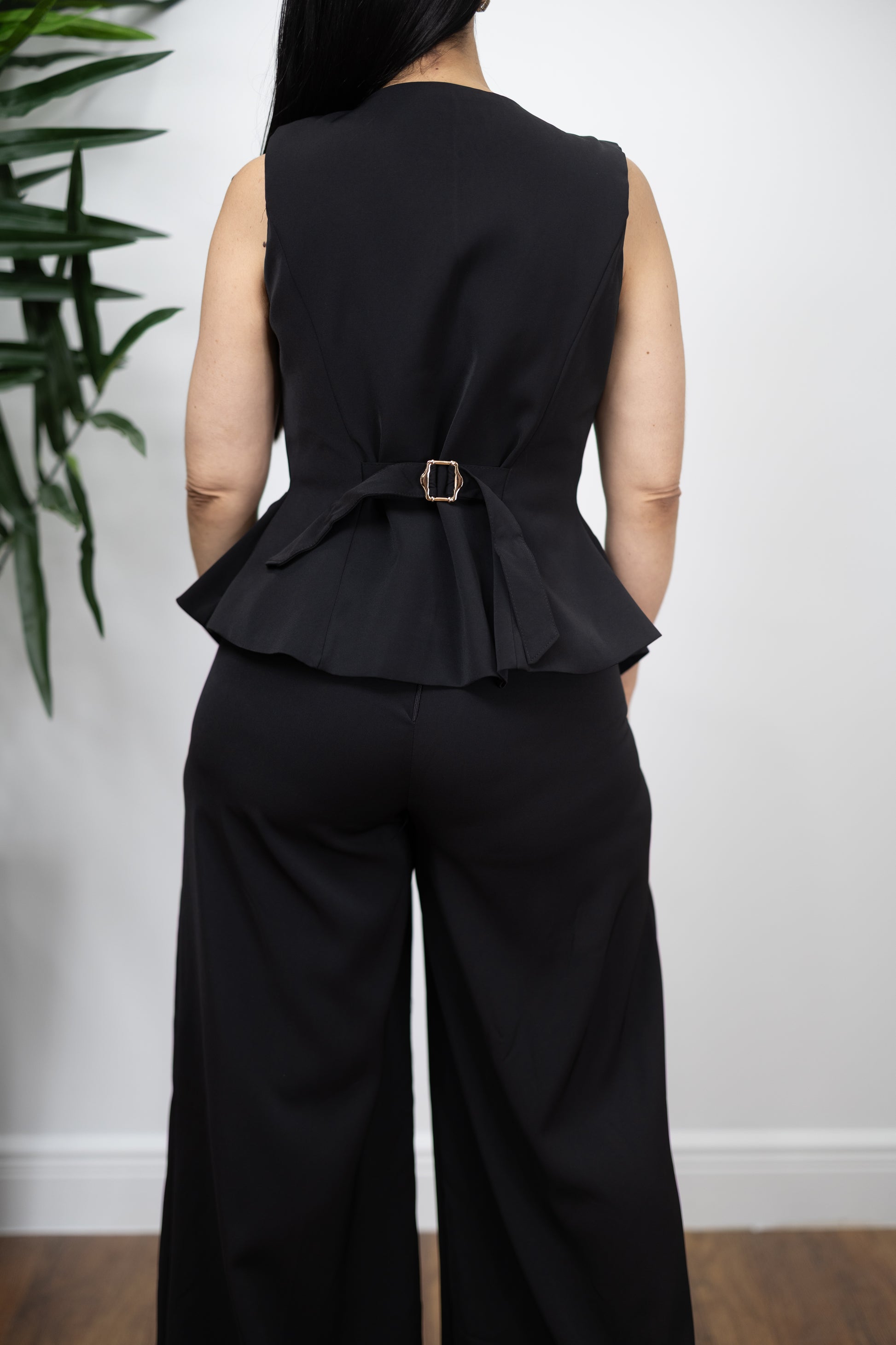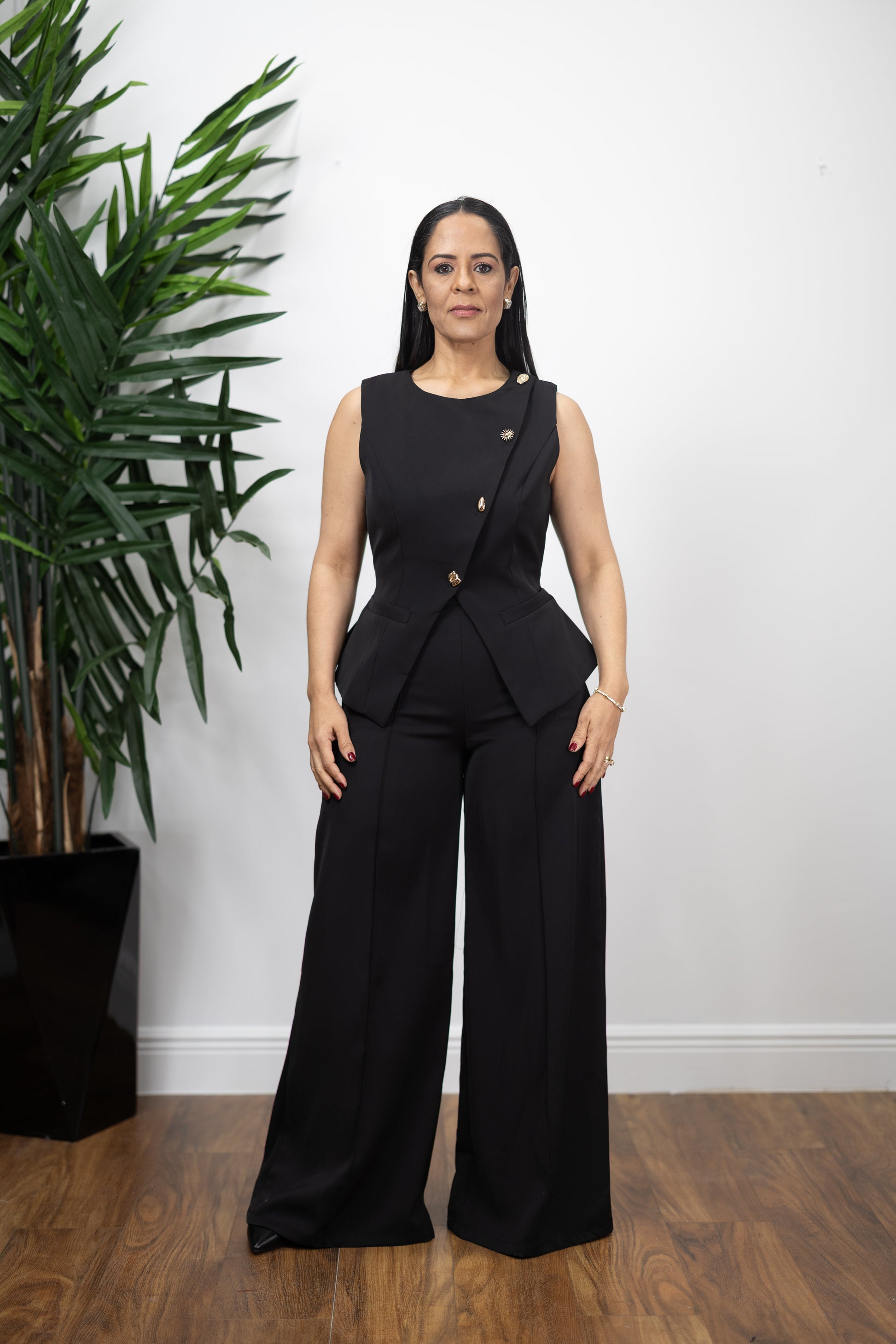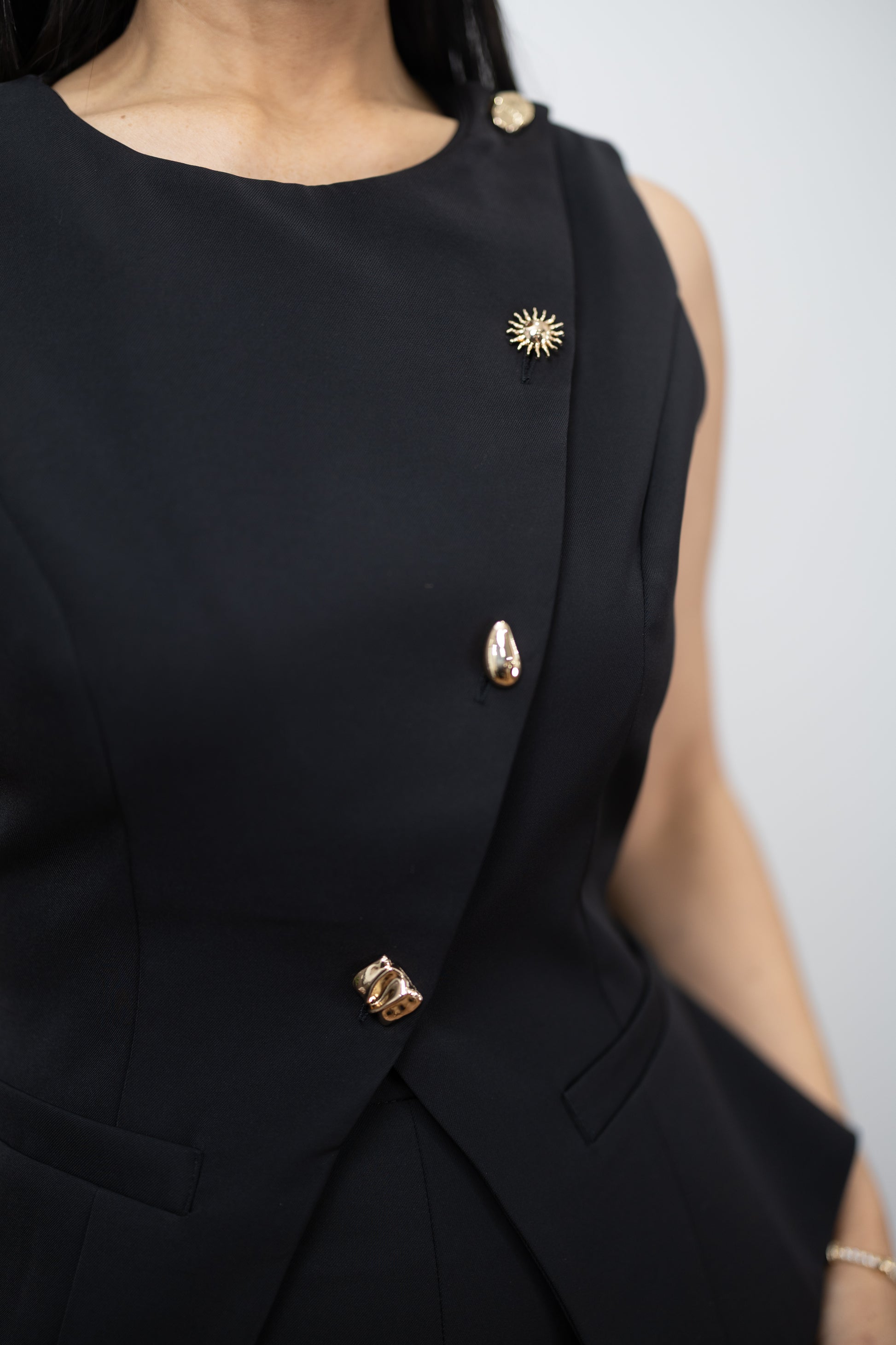 Elegance meets power. This sleeveless black two-piece set features a tailored, asymmetrical top with gold button accents for a refined and modern touch. The fitted waist enhances the silhouette, while the wide-leg trousers create a balanced, confident look.