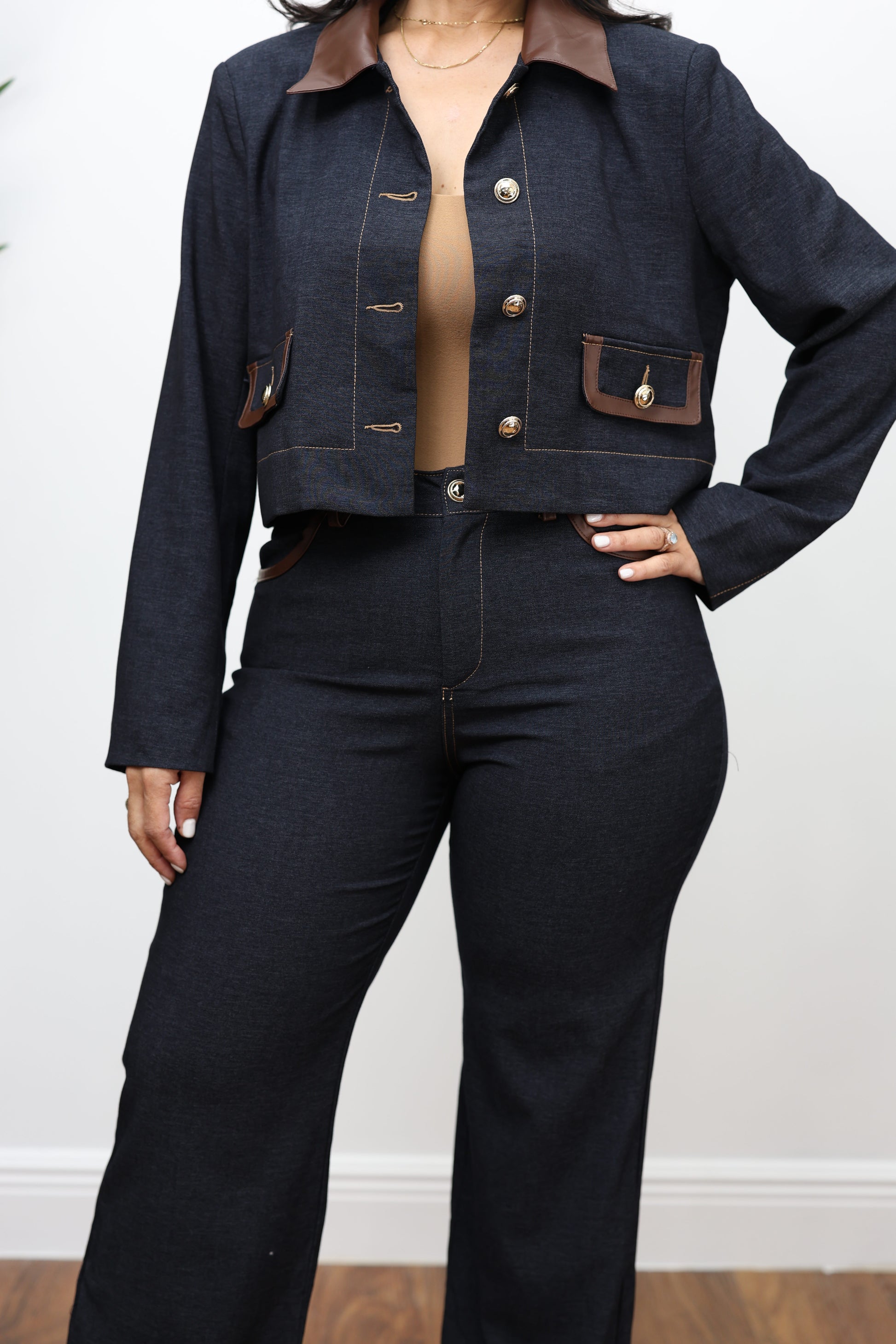 conjunto en denim oscuro redefine la sofisticación con un toque moderno. Incluye un blazer cropped de manga larga con detalles en cuero sintético marrón en el cuello y bolsillos frontales, realzado con botones metálicos dorados que aportan un aire chic y refinado. El pantalón de corte recto y talle alto complementa perfectamente el conjunto, estilizando la figura y ofreciendo comodidad en cada movimiento.