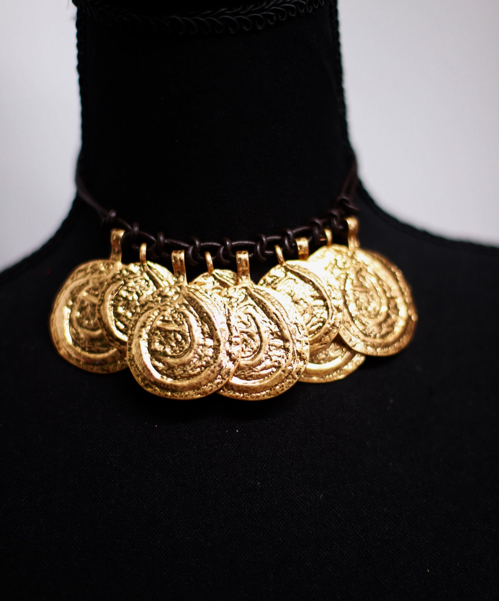 A powerful statement piece featuring large embossed golden medallions arranged in a striking choker design. Each medallion carries a textured finish with regal detail, radiating strength, opulence, and timeless elegance.
