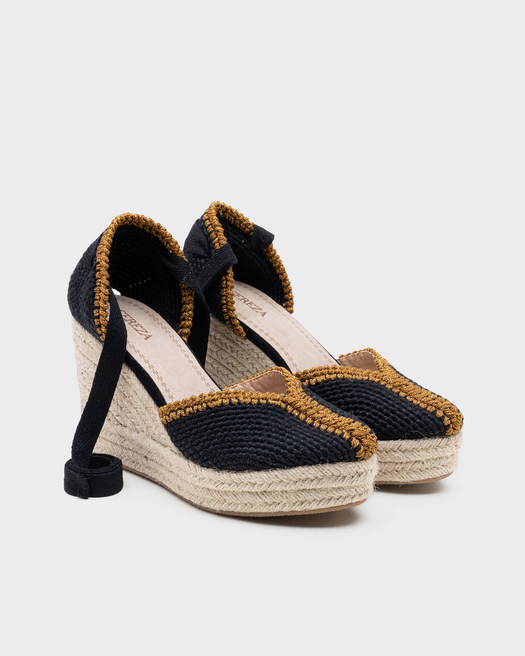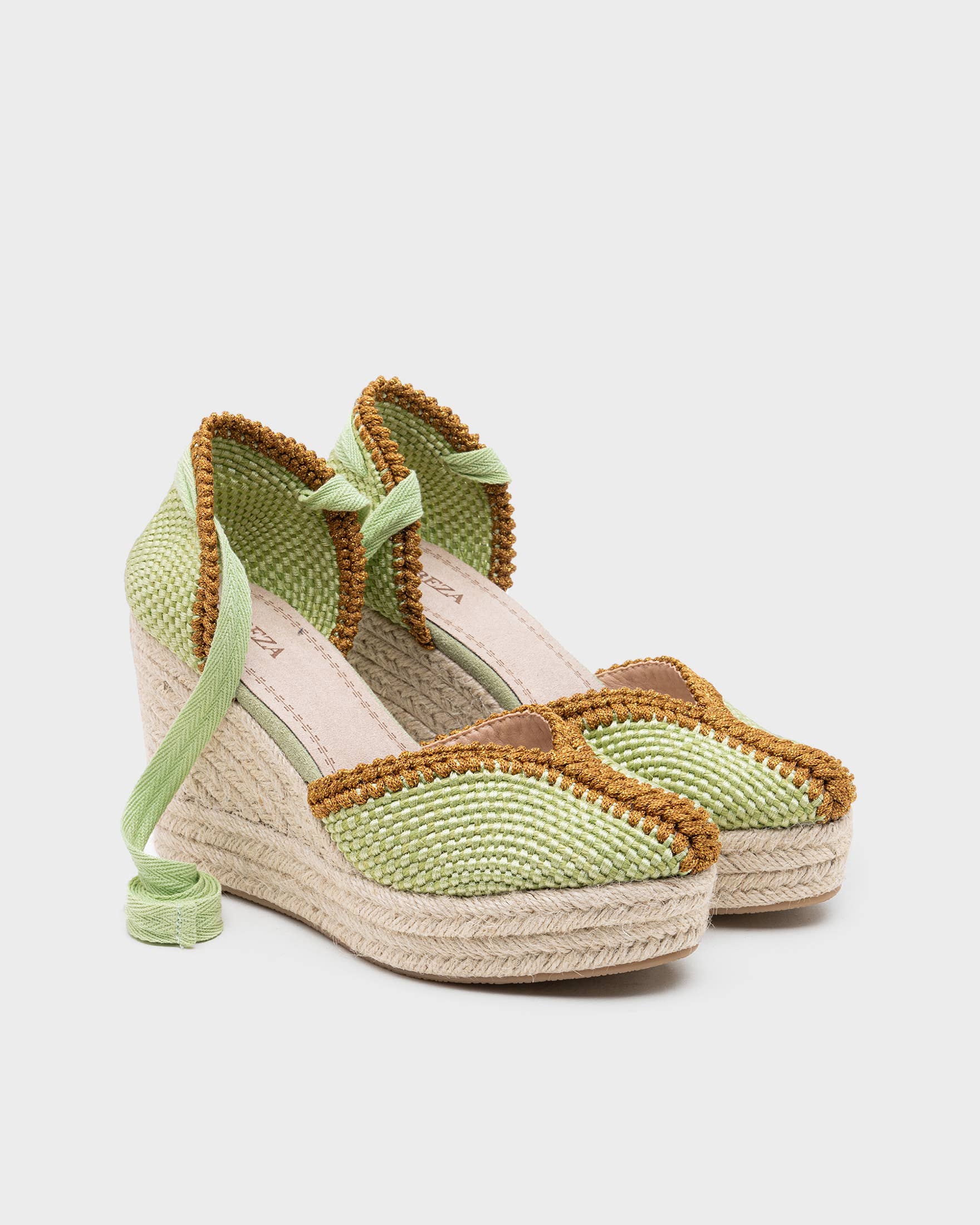 Handwoven Raffia Wedge Espadrille Sandals. Cotton Herringbone Ribbon Closure, cushioned insole.