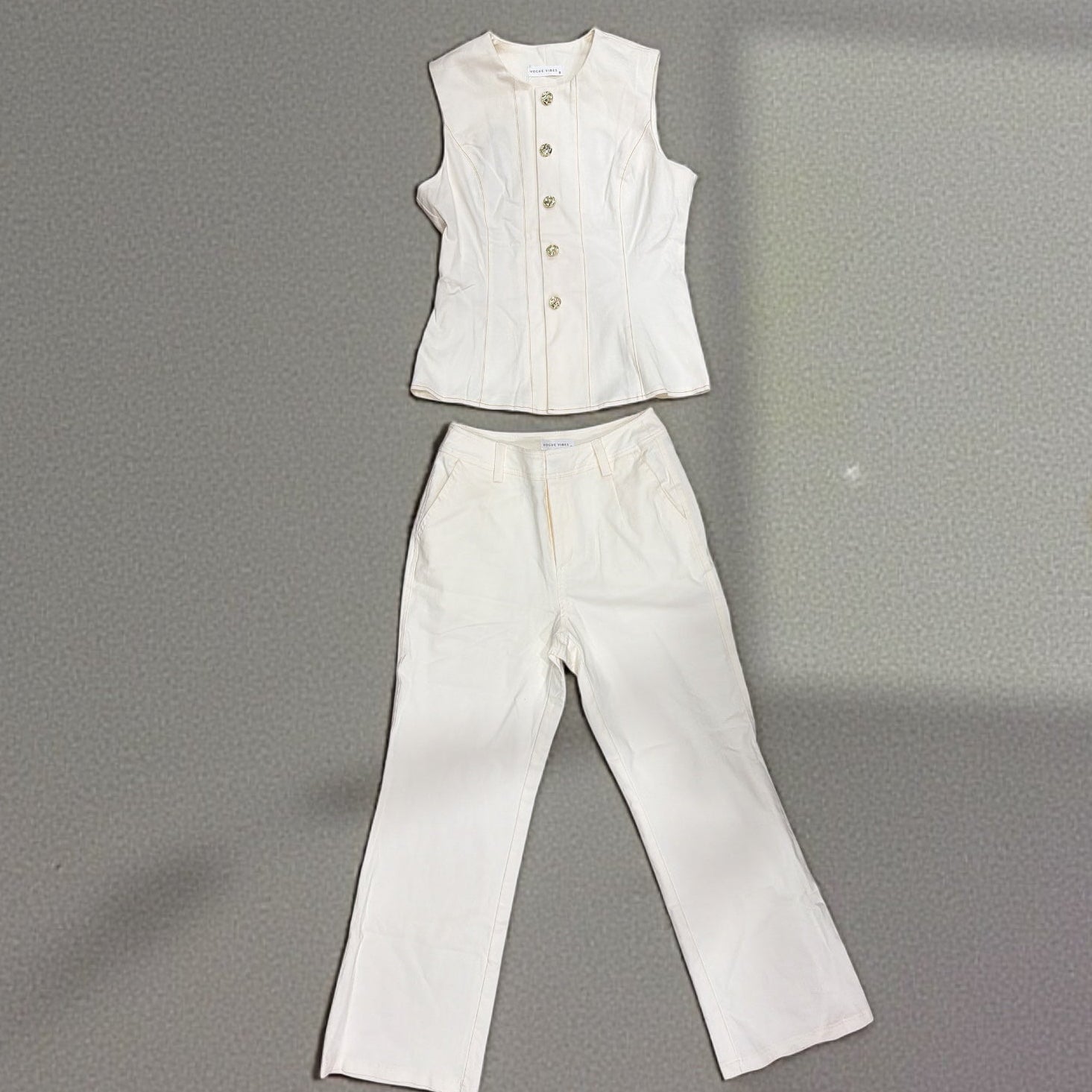 The Ivory Poise Tailored Set embodies refined simplicity. Designed with a structured sleeveless vest featuring delicate gold buttons and perfectly tailored straight-leg trousers, this set delivers effortless sophistication for modern dressing.