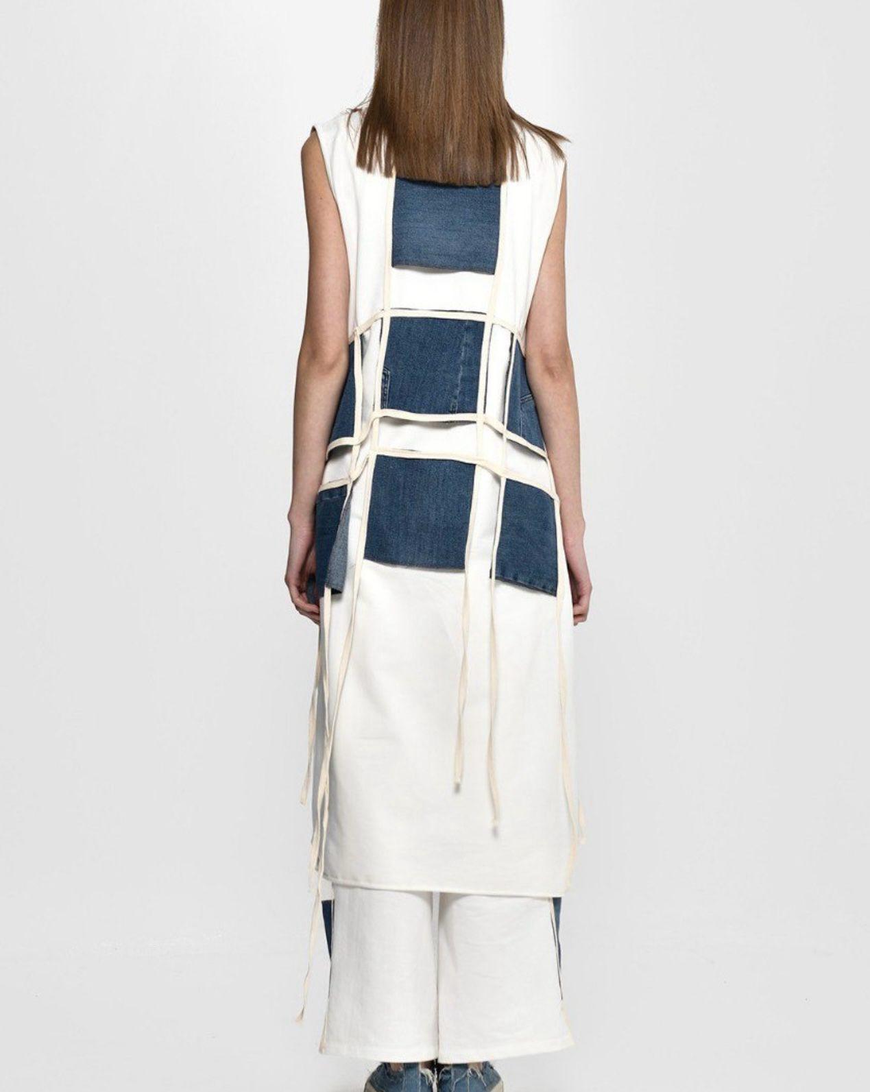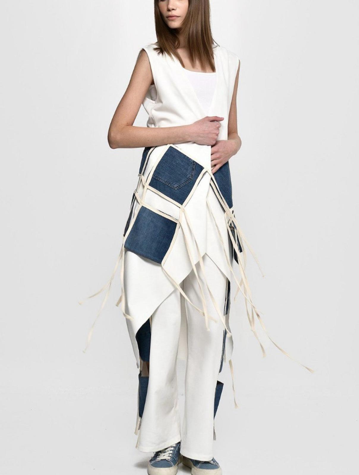 Discover this exclusive long sleeveless vest in white, enhanced with striking geometric blue denim appliqués. Its modern, deconstructed design features side slits and unique waist ties. Ideal for an avant-garde look with personality. Add a unique touch to your wardrobe.