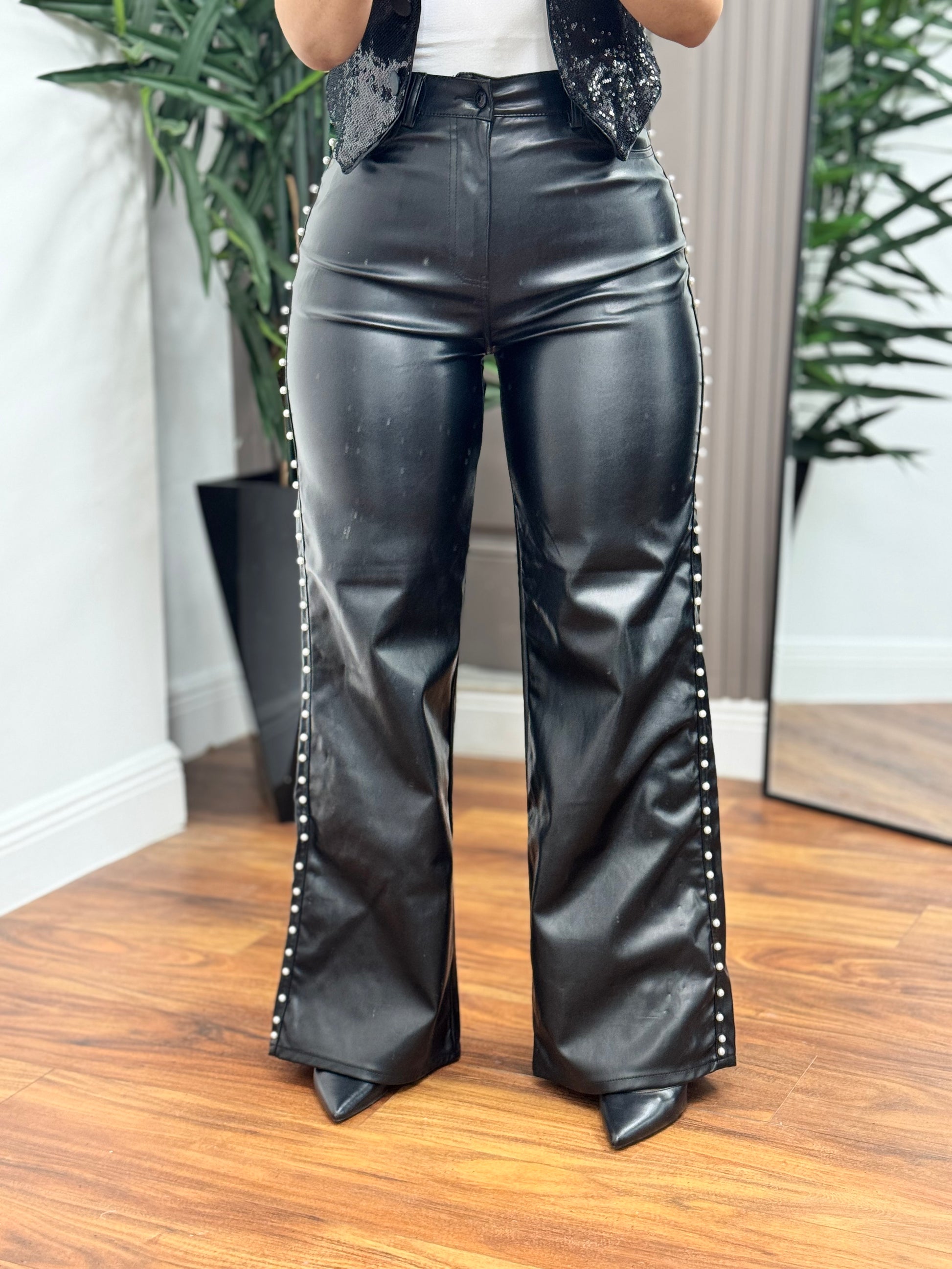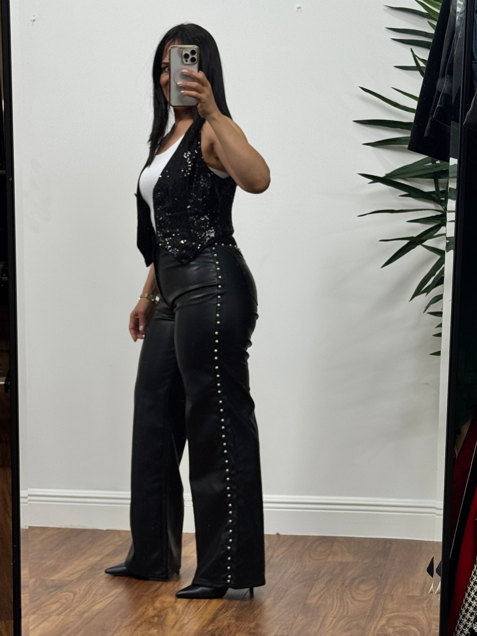 designed to command attention. These high-waisted faux leather pants feature a sleek straight-leg silhouette with metallic stud detailing along the sides, adding just the right amount of edge and glamour. The soft inner lining ensures comfort while maintaining a structured, curve-enhancing fit. Perfect to pair with heels or boots for a night out, a concert, or a chic dinner look.