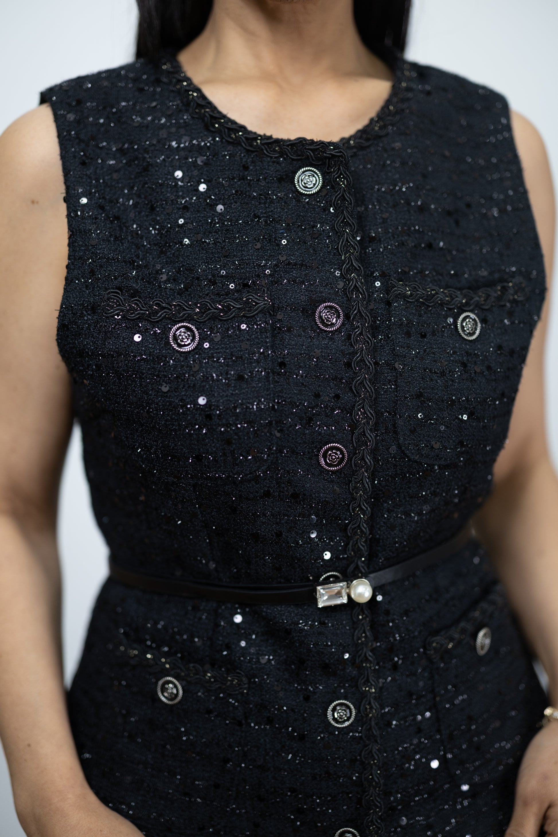 Inspirado en la sofisticación parisina, este chaleco sin mangas combina el clásico tweed con detalles modernos. Su tejido negro con sutiles lentejuelas aporta un brillo elegante, mientras los botones metálicos y el cinturón con detalle de perla añaden un toque de lujo refinado.