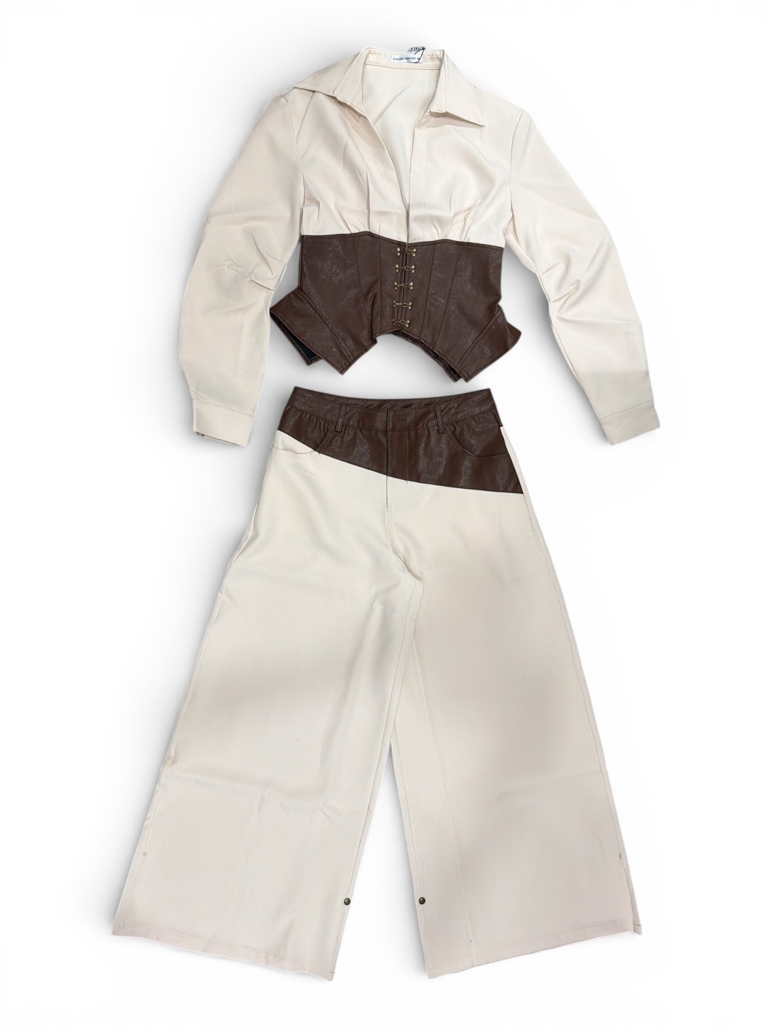the Milano Authority Corset Set is designed for the woman who leads with presence. This tailored ensemble combines fluid wide-leg trousers and a crisp blouse, elevated by a sculpting faux-leather corset belt that defines the waist and creates a striking silhouette.