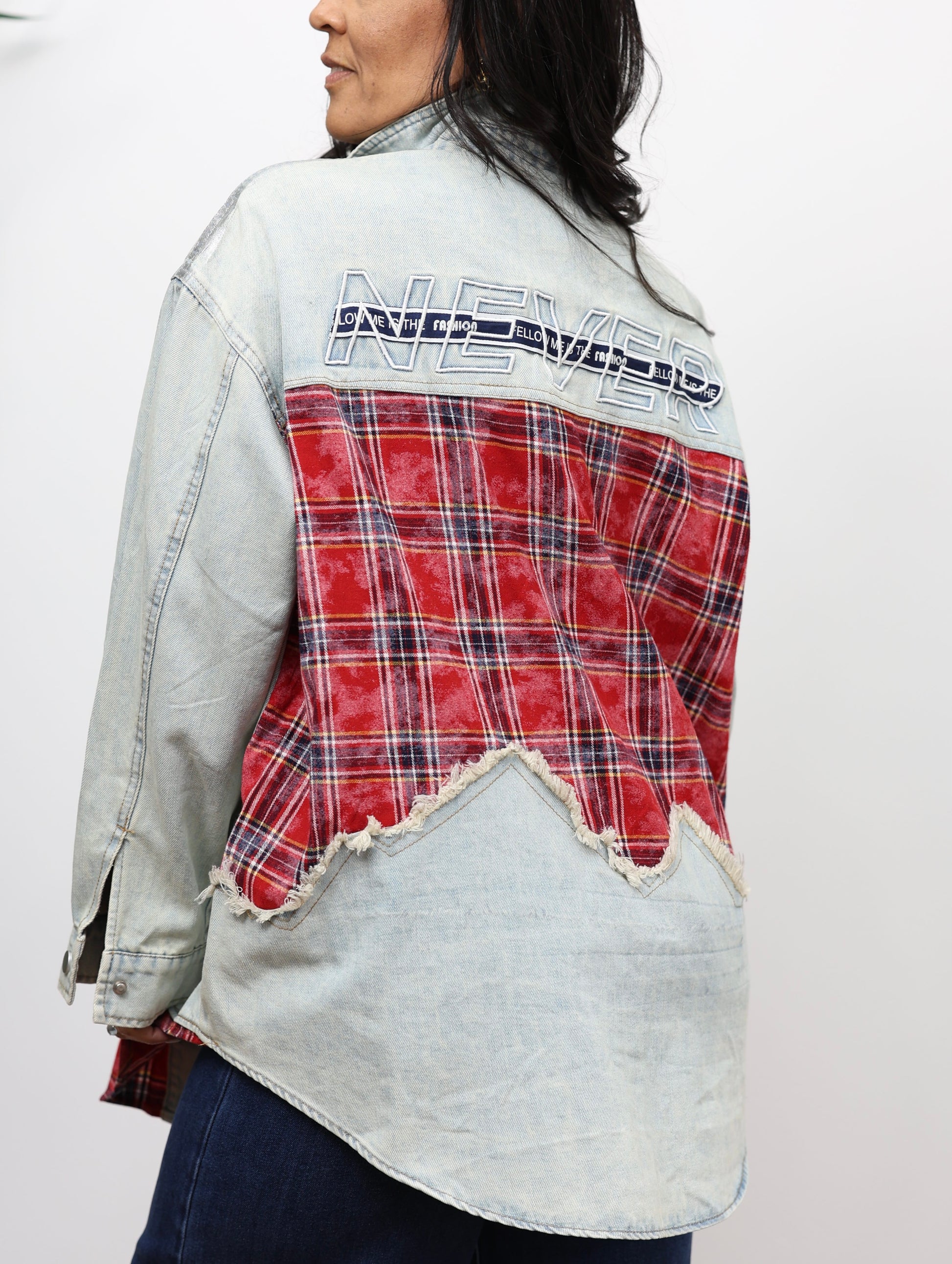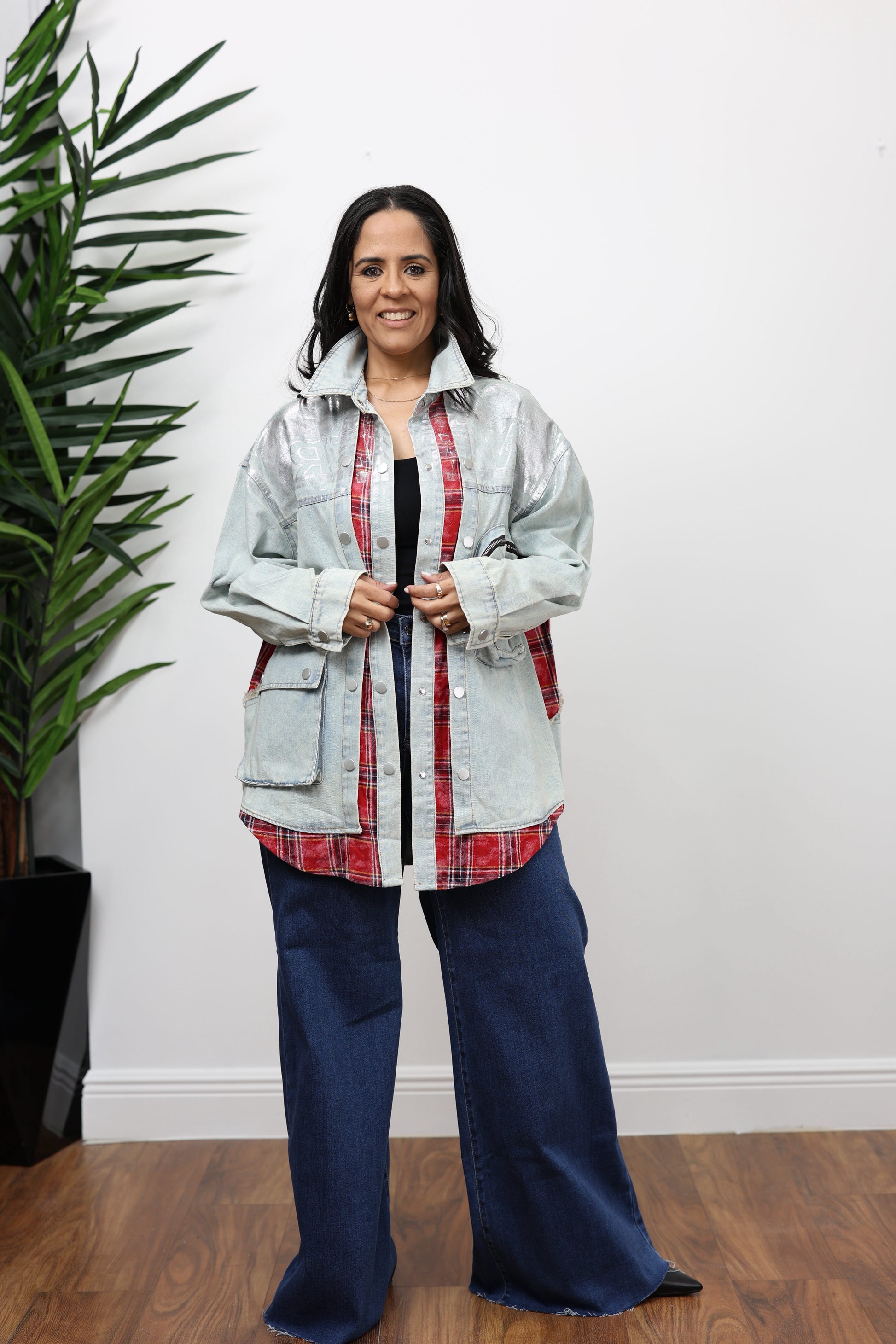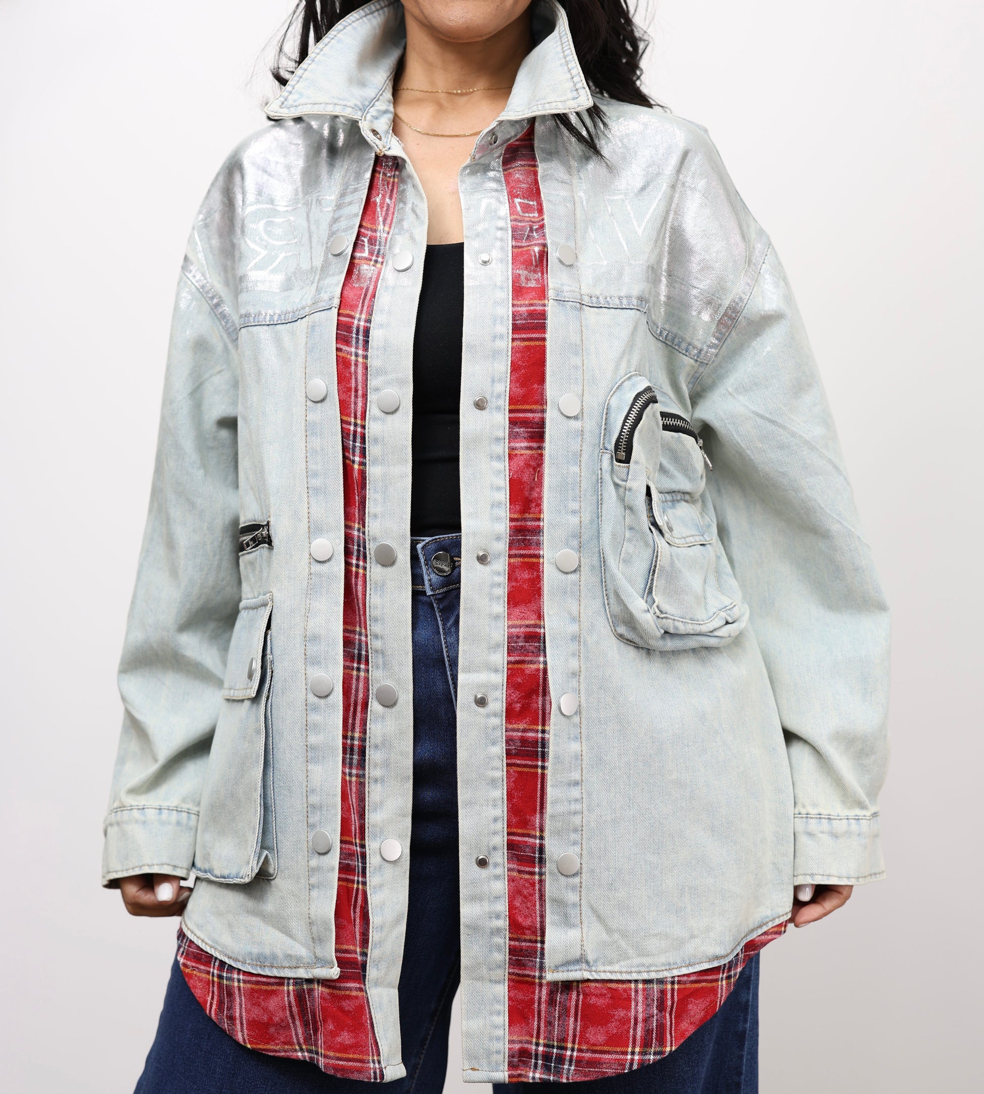 Chaqueta de mezclilla en tono claro con toques plateados en los hombros y pecho, estilo moderno y urbano. Combina bolsillos frontales funcionales y botones metálicos, ideal para looks en capas.