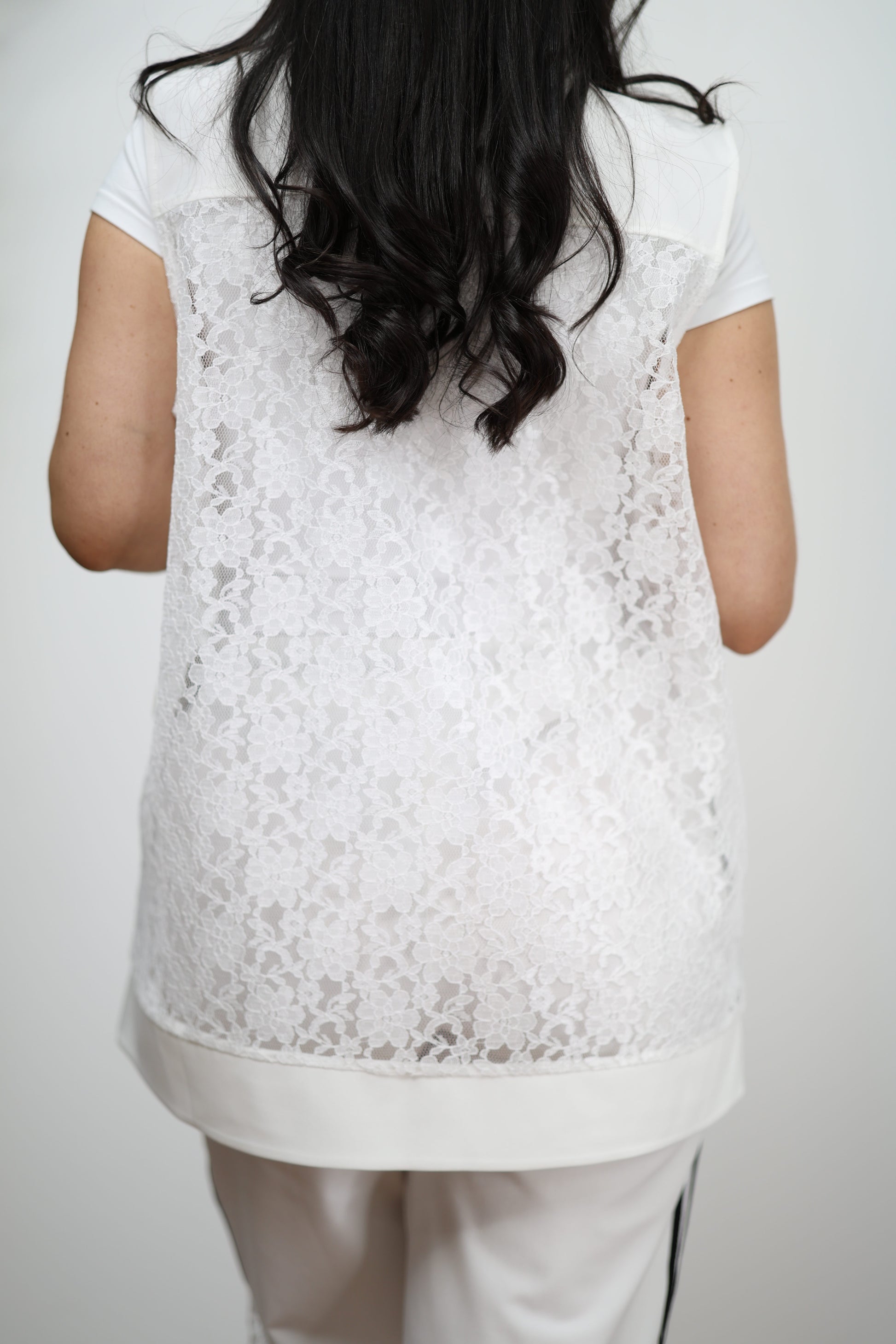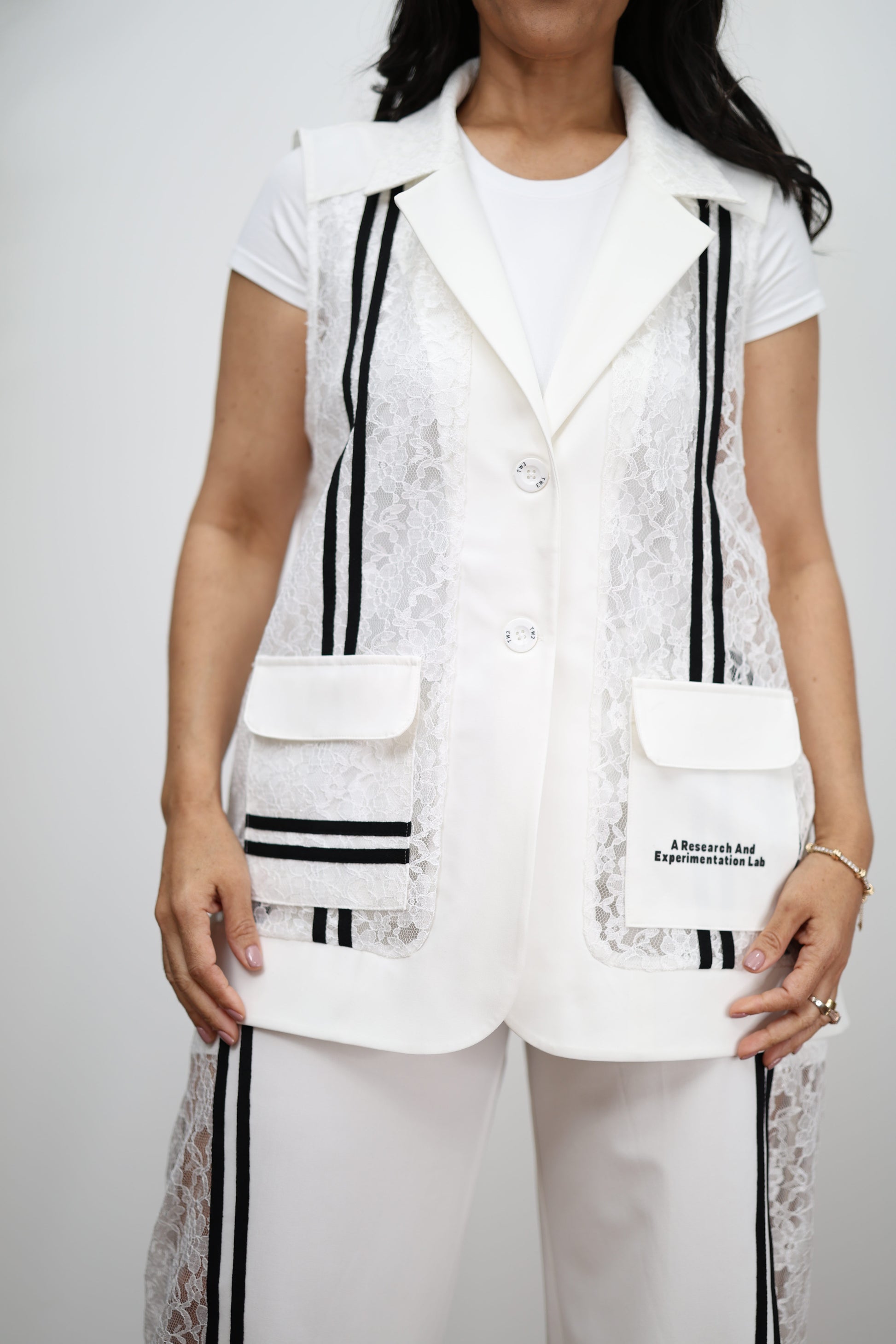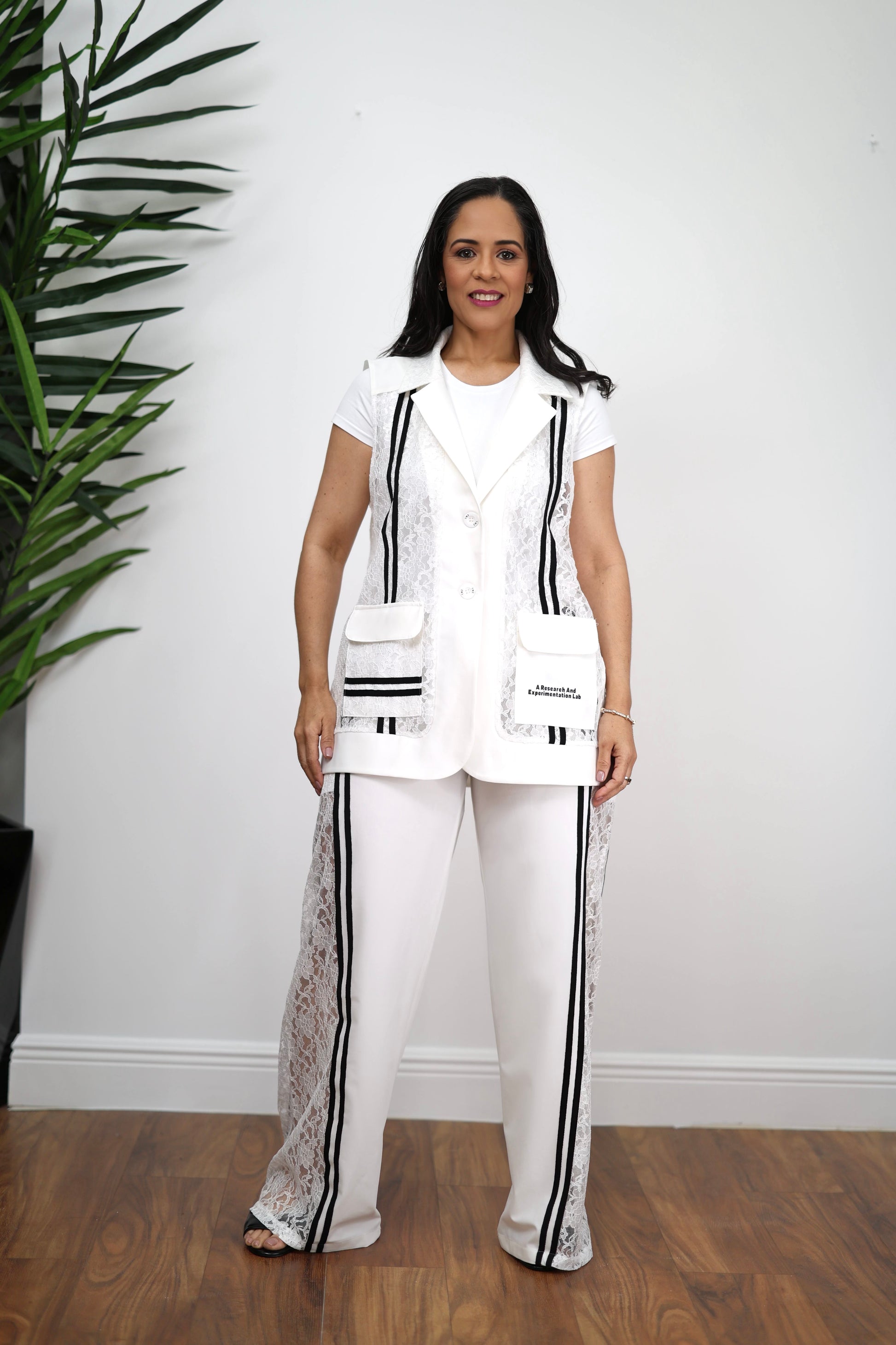 sofisticado conjunto de dos piezas combina elegancia y modernidad. Incluye un chaleco largo en encaje blanco con solapa clásica, botones frontales y bolsillos de solapa decorados con rayas negras verticales que estilizan la silueta. El pantalón de pierna recta presenta paneles laterales en encaje con franjas negras que aportan contraste y un efecto alargador.