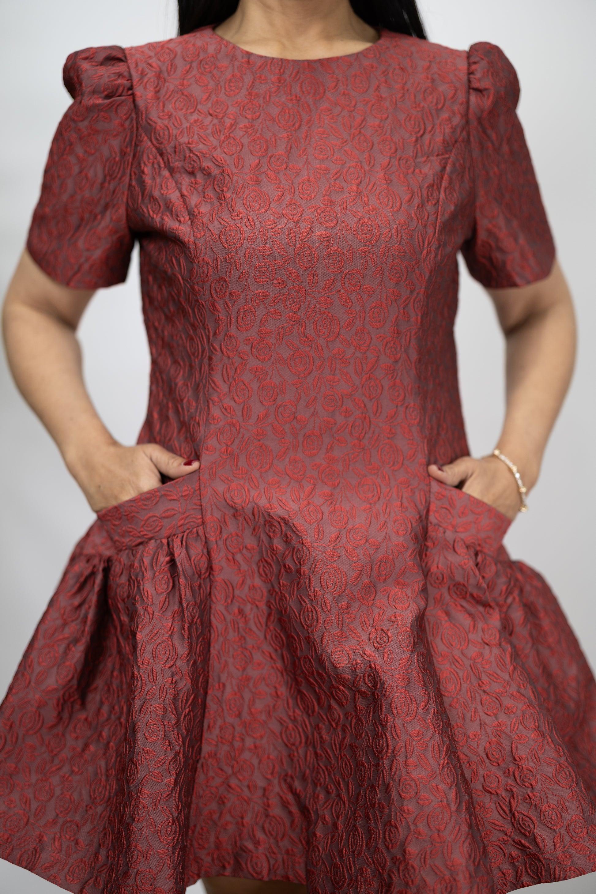 El Vestido Brocado Ruby Flair combina elegancia clásica con un toque moderno. Su tela brocada de textura sutil y su diseño estructurado aportan un aire refinado y femenino. Con cuello redondo, mangas cortas con volumen y falda acampanada, es ideal para eventos de día o de noche.